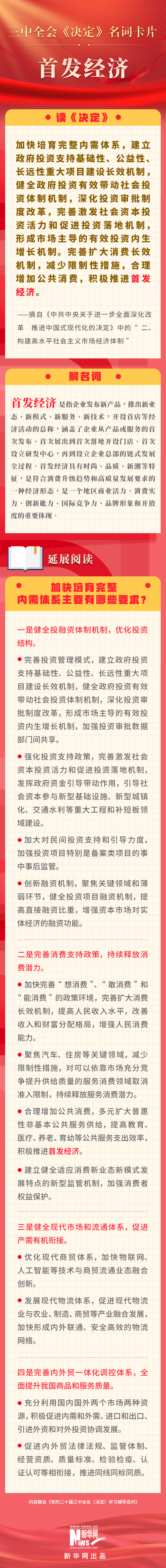 黨的二十屆三中全會審議通過了《中共中央關于進一步全面深化改革、推進中國式現(xiàn)代化的決定》。新華網(wǎng)依據(jù)《黨的二十屆三中全會〈決定〉學習輔導百問》,制作三中全會《決定》系列名詞卡片,和大家一起來深入學習領會二十屆三中全會精神。本期名詞是“首發(fā)經(jīng)濟”。