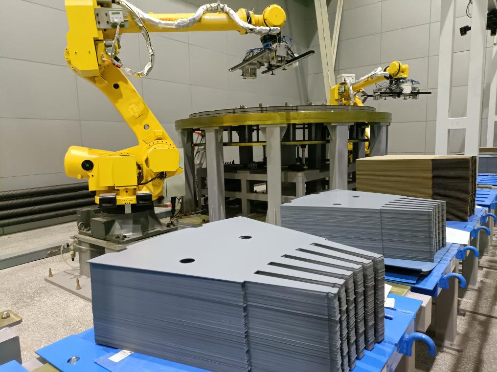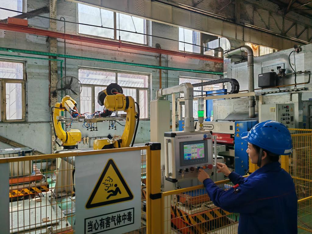 2024年上半年,東輕“數(shù)智化圓錠加工園區(qū)”正式落成。在這條由蘇聯(lián)援建的鋁合金中小直徑圓錠生產(chǎn)線上,機器人無需人工干預(yù),通過全自動的定位和抓取,短時間內(nèi)就能完成上料填裝等全套流程?!案脑烨埃@條生產(chǎn)線各道工序均需人工參與,效率較低且伴有高強度重復(fù)性勞動?!睎|輕熔鑄廠設(shè)備保障組二級技師王驍睿介紹,“機器人操作在保障生產(chǎn)進度、提高作業(yè)質(zhì)量的同時,有效緩解了崗位人手配置壓力。人機分離后,安全保障也得到了明顯提升。”