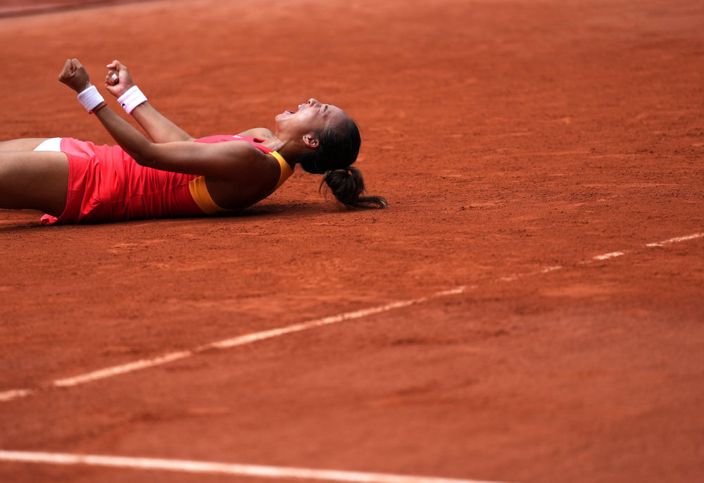 中國(guó)選手鄭欽文慶祝勝利。新華社記者 萬象 攝