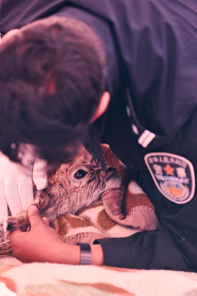很難想象,這些面龐黝黑、身材魁梧的藏族漢子會(huì)趴在一只小藏羚羊身邊,一邊輕柔地給它擦拭身體,一邊像安撫哭鬧的孩子一樣,輕聲細(xì)語(yǔ)地告訴它:“不要害怕,我們來(lái)救你了”。