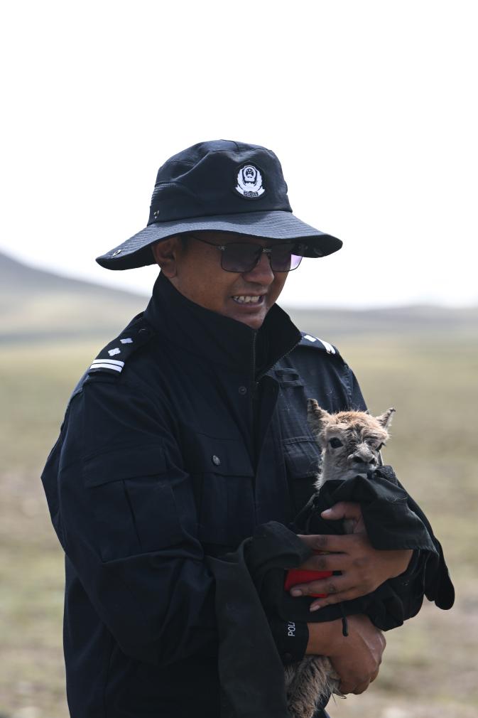 這時(shí),可可西里森林公安局輔警尼瑪扎西接過(guò)了多結(jié)仁欠懷里的小藏羚羊。小藏羚羊渾身濕漉漉的,不停地發(fā)抖。尼瑪扎西隨即脫下自己的衣服,一邊給小藏羚羊擦身體,一邊溫柔地說(shuō):“你的媽媽找不到了,我們來(lái)當(dāng)你的媽媽?!?/p>