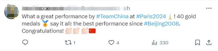 “中國隊在2024巴黎奧運(yùn)會上的表現(xiàn)太棒了!40枚金牌收官,這是自2008年北京奧運(yùn)會以來中國隊的最佳表現(xiàn)。恭喜!”