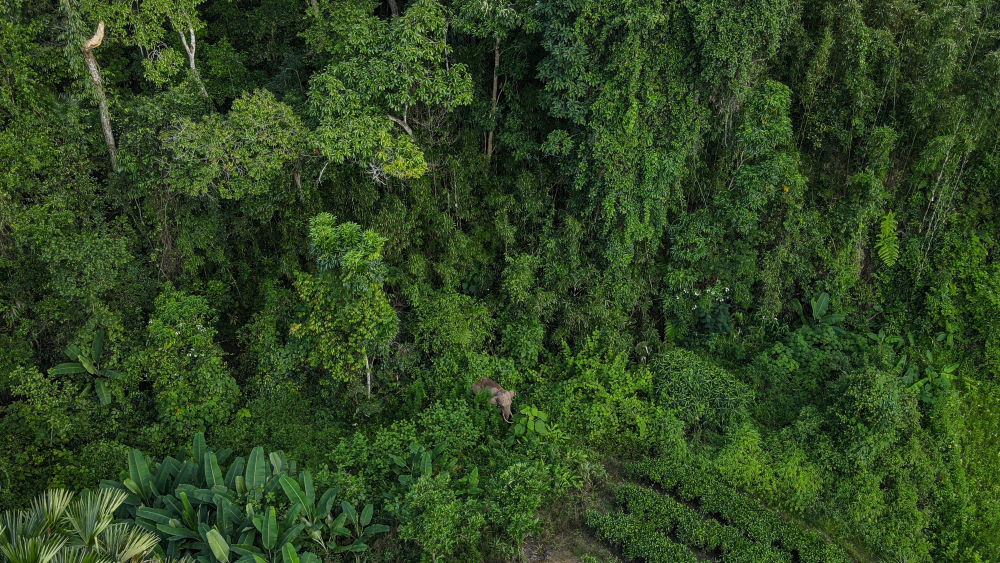 在云南西雙版納國家級(jí)自然保護(hù)區(qū)勐養(yǎng)片區(qū)邊緣活動(dòng)的亞洲象阿寶(7月26日無人機(jī)照片)。(許團(tuán)明 攝)