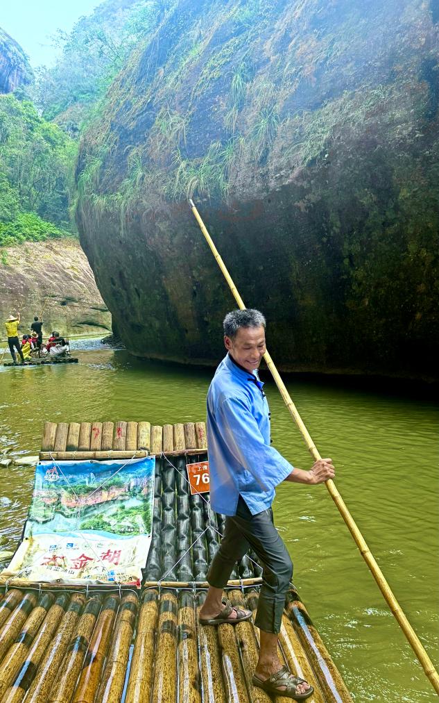 “我們一趟就要撐萬把下竹竿,一年下來要撐三百多萬下?!备闪?5年的上清溪排工黃盛騰談起他的排工生活,幽默風趣,“上清溪全長16.5公里,落差比較大,排走得比較緩慢一些,那就比較吃力一些,所以說我們的工人叫‘吃飽了撐著’。”