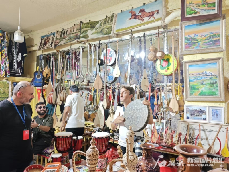 此外,喀什古城的銅器、木器、手工樂器、葫蘆烙畫等各類傳統(tǒng)非遺技藝,也成為土耳其媒體人關(guān)注的焦點(diǎn)。在木器巴扎內(nèi),手藝人拿起馬克筆、電烙筆、刻刀等工具,在葫蘆上勾好型,隨著工具在表面游走,一幅精美獨(dú)特的圖案便躍然于葫蘆之上。這一幕吸引了一日?qǐng)?bào)總編輯易卜拉欣·瓦爾勒,“這是我第一次看到葫蘆烙畫,太神奇了,僅用幾件工具,就能將葫蘆變成一件精美的藝術(shù)品。”