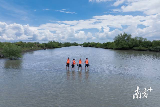 民警涉水前往麻章區(qū)湖光鎮(zhèn)料村一海邊養(yǎng)殖塘,查看紅樹林復(fù)種情況。