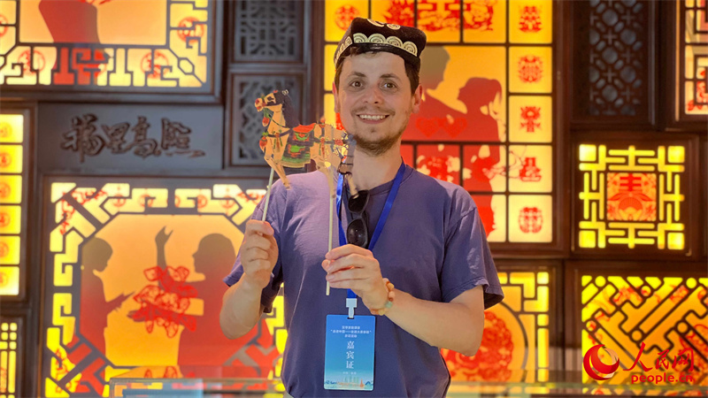 俄羅斯翻譯家、現(xiàn)任莫斯科物理技術(shù)學(xué)院中文系副教授羅子毅與皮影合影。人民網(wǎng) 李欣洋攝