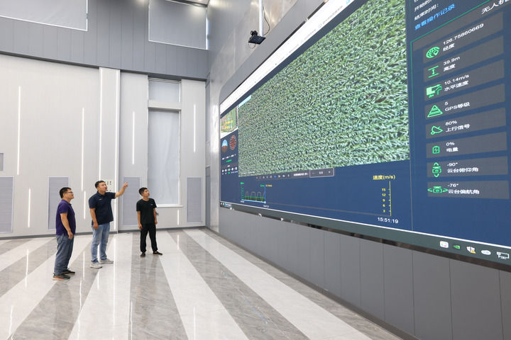 在黑龍江北大荒集團(tuán)趙光農(nóng)場有限公司科技服務(wù)中心,農(nóng)業(yè)科技人員通過田間物聯(lián)網(wǎng)系統(tǒng)在數(shù)字農(nóng)業(yè)指揮大廳實(shí)時(shí)觀看智能無人機(jī)回傳的視頻,及時(shí)查看田間作物長勢情況(2024年7月22日攝)。新華社發(fā)(錢泊羽攝)