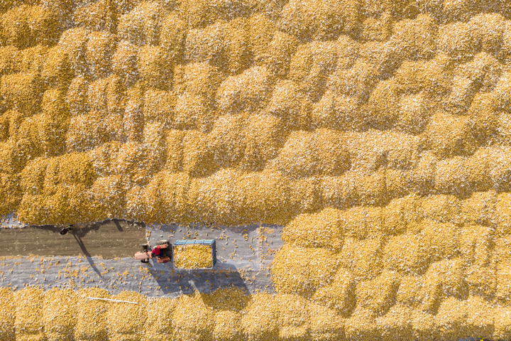 在黑龍江省肇東市五里明鎮(zhèn)東升村,農(nóng)民把收獲的玉米運(yùn)到當(dāng)?shù)剞r(nóng)業(yè)合作社指定的地點(diǎn)進(jìn)行晾曬(2023年10月19日攝,無人機(jī)照片)。新華社記者 謝劍飛 攝