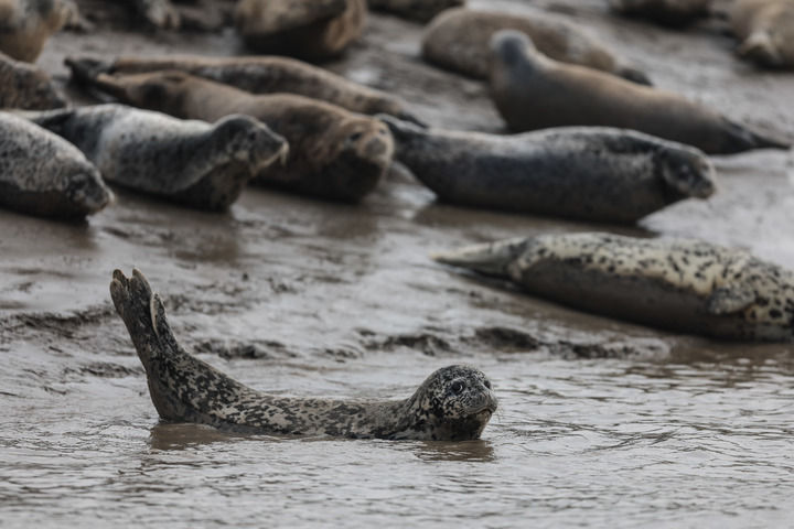 西太平洋斑海豹在遼寧盤錦三道溝海域的灘涂上休息(2024年4月9日攝)。新華社記者 潘昱龍 攝