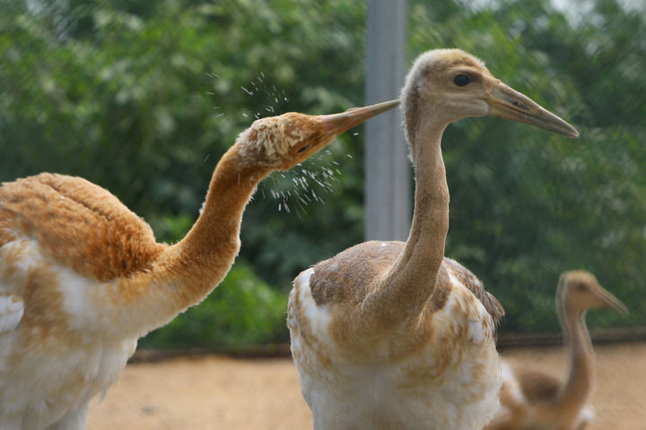 丹頂鶴雛鳥在遼寧盤錦市林業(yè)和濕地保護(hù)服務(wù)中心鶴類繁育保護(hù)站內(nèi)嬉戲(2023年8月3日攝)。新華社記者 陳為 攝