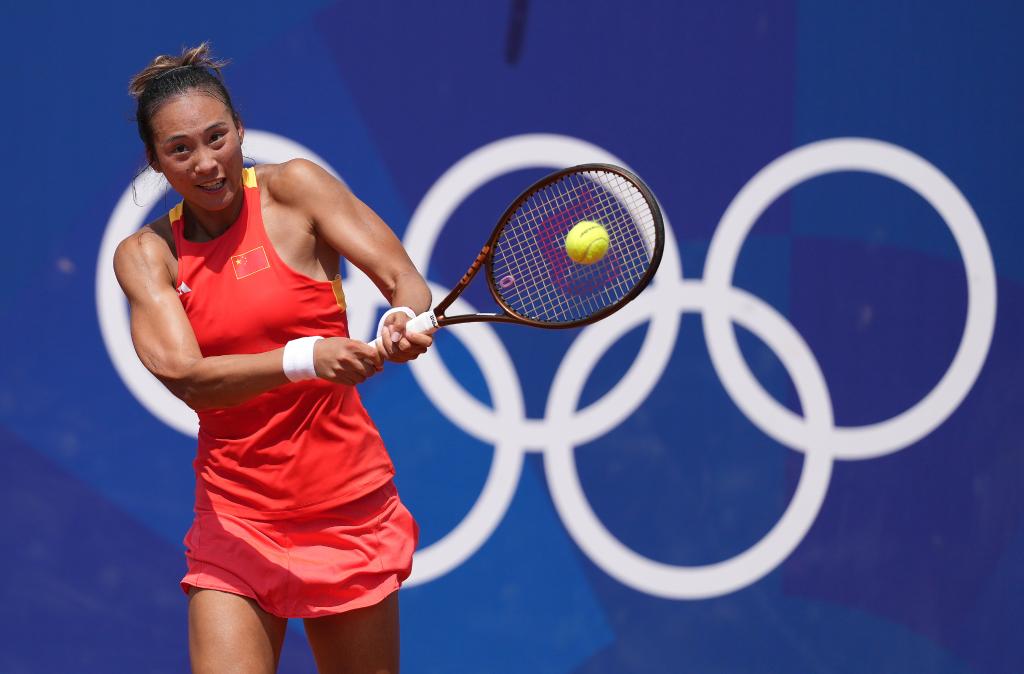 7月30日,鄭欽文在巴黎奧運(yùn)會(huì)網(wǎng)球女子單打第三輪比賽中回球。新華社記者 萬象 攝