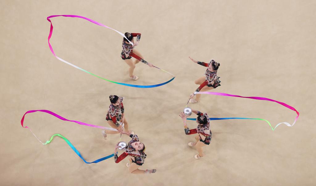 8月10日,中國隊(duì)在巴黎奧運(yùn)會(huì)藝術(shù)體操項(xiàng)目集體全能決賽中。新華社記者 郭昱 攝