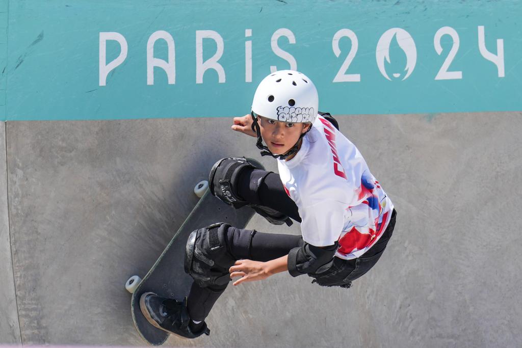 8月6日,中國選手鄭好好在巴黎奧運(yùn)會(huì)滑板女子碗池預(yù)賽中。新華社記者 杜宇 攝
