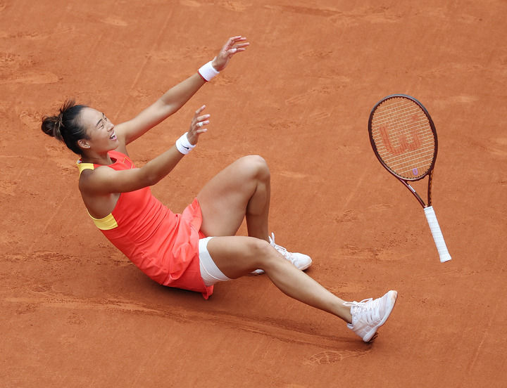 中國(guó)選手鄭欽文在巴黎奧運(yùn)會(huì)網(wǎng)球女子單打金牌賽后慶祝奪冠(2024年8月3日攝)。新華社記者 高靜 攝