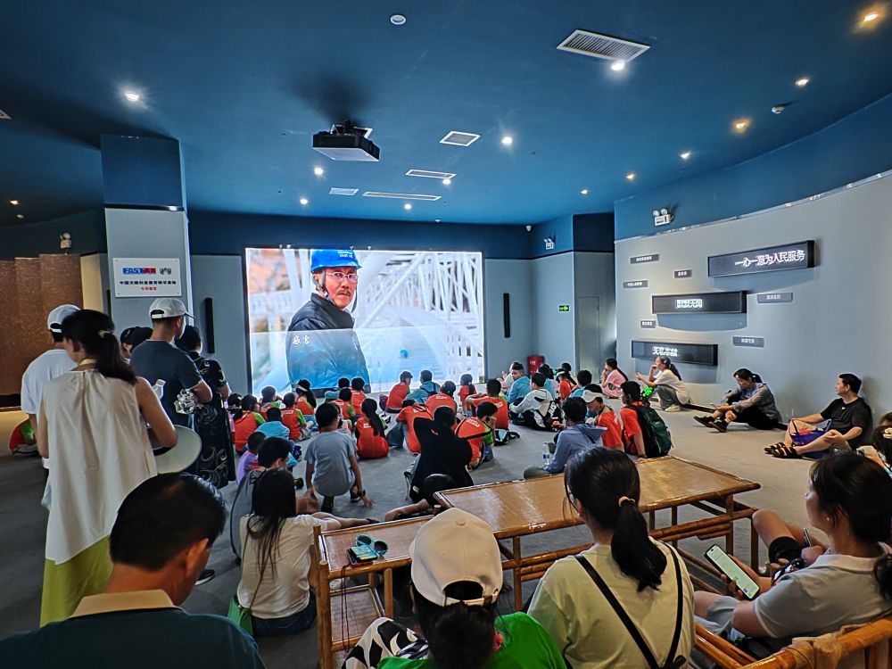 8月14日,來自河南鄭州研學團隊的中小學生在南仁東事跡館觀看影片。新華社記者 齊健 攝