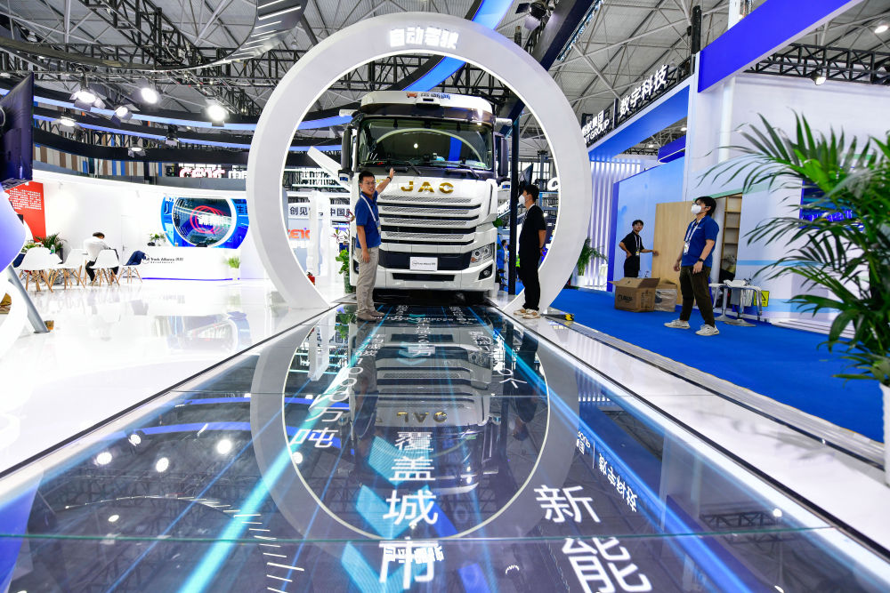 8月28日,工作人員在數(shù)博會(huì)上介紹無(wú)人駕駛重型卡車(chē)。