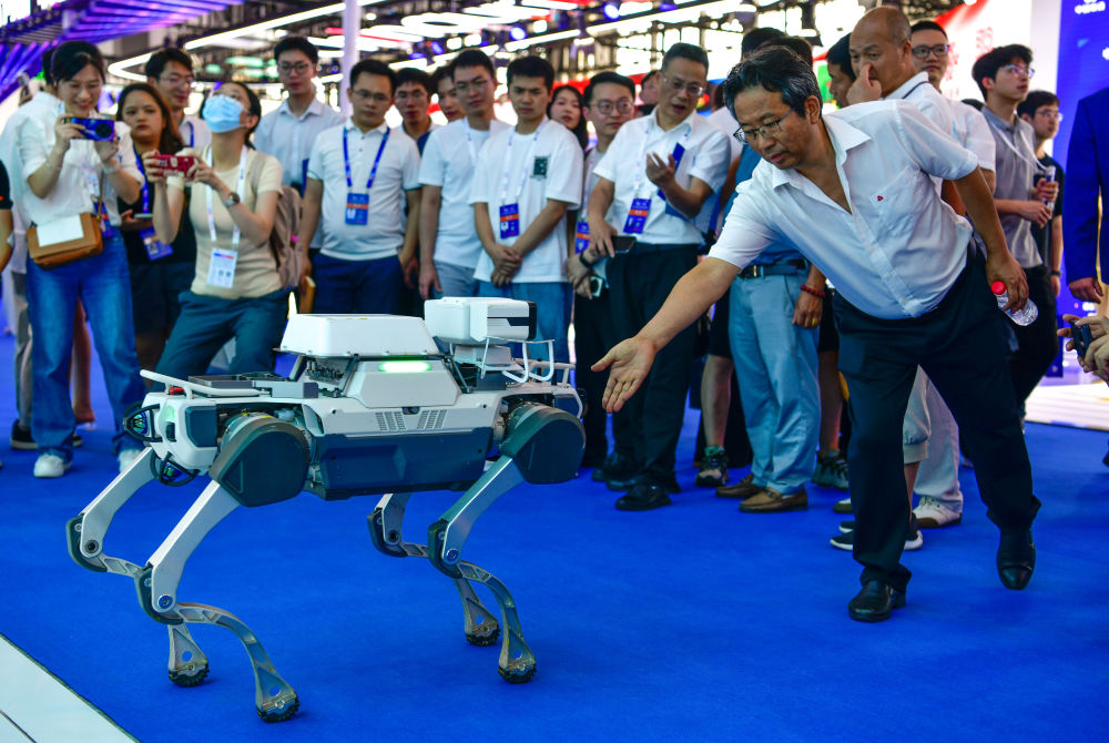 8月28日,參會(huì)人員在數(shù)博會(huì)上與機(jī)器狗互動(dòng)。