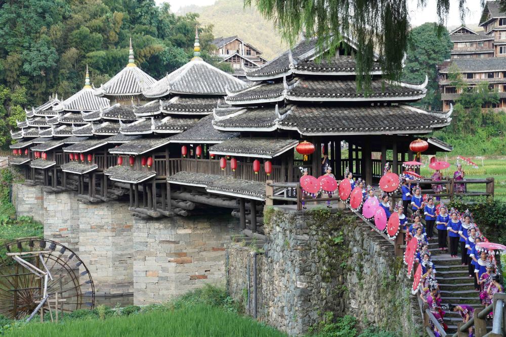 風(fēng)雨橋上,侗家兒女著盛裝、佩銀飾,待游人行至橋前,紅傘輕搖,高音起調(diào),低音輕和,嘹亮婉轉(zhuǎn)的迎賓歌唱響,獻(xiàn)上侗鄉(xiāng)迎客的最高禮遇。