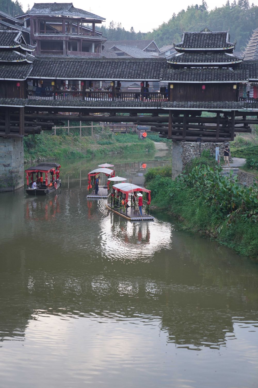 8月26日,在廣西三江侗族自治縣程陽八寨景區(qū),游人乘船游覽。新華社記者 尹棟遜 攝