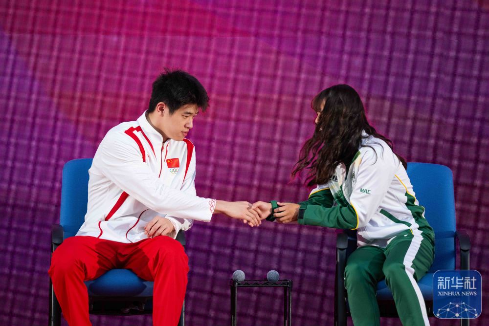 ↑9月1日,游泳運(yùn)動員潘展樂(左)在活動中與澳門運(yùn)動員握手交流。
