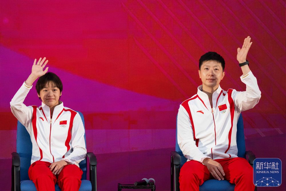 ↑9月1日,跳水運(yùn)動員全紅嬋(左)與乒乓球運(yùn)動員馬龍?jiān)诨顒又袚]手致意。