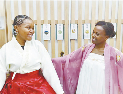 當(dāng)?shù)貢r間4月20日,為慶祝第十五個聯(lián)合國中文日,南非德班理工大學(xué)孔子學(xué)院舉辦以“說文解字,以茶會友”為主題的活動?;顒訁⑴c者身穿中國傳統(tǒng)服飾,共同探討漢字和茶文化。圖為兩名當(dāng)?shù)嘏⒃嚧┲袊鴤鹘y(tǒng)服飾。
