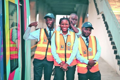 6月12日,在尼日利亞拉各斯,拉各斯輕軌藍(lán)線項(xiàng)目動(dòng)車(chē)組列車(chē)司機(jī)組長(zhǎng)伊莎貝拉·亞當(dāng)斯·伊斯拉埃爾(中)與同事在站臺(tái)上合影。新華社發(fā)
