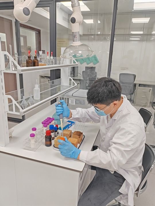 2024年7月8日,研究人員在杭州良渚古城遺址世界遺產監(jiān)測管理中心的潮濕環(huán)境土遺址保護實驗室進行試驗。 新華社記者 馮源 攝