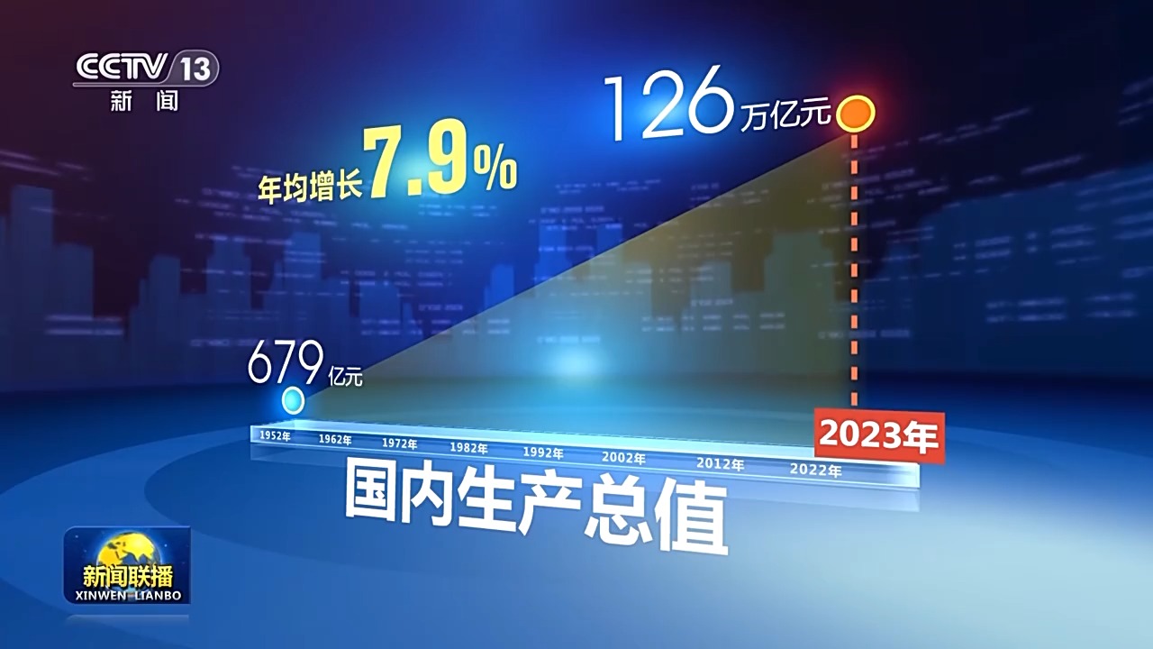 我國國內(nèi)生產(chǎn)總值,從有數(shù)據(jù)統(tǒng)計(jì)以來的1952年的679億元,增長到2023年的126萬億元,年均增長7.9%。