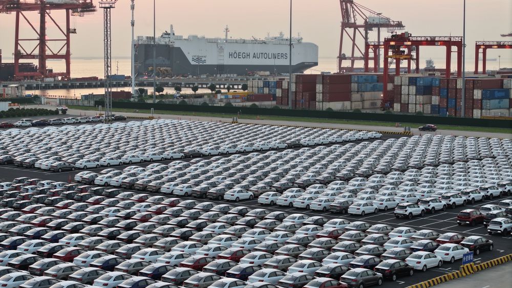 汽車(chē)運(yùn)輸船“禮諾極光”輪靠泊江蘇省蘇州港太倉(cāng)港區(qū),即將裝載2336輛汽車(chē)首航歐洲(無(wú)人機(jī)照片,8月23日攝)。