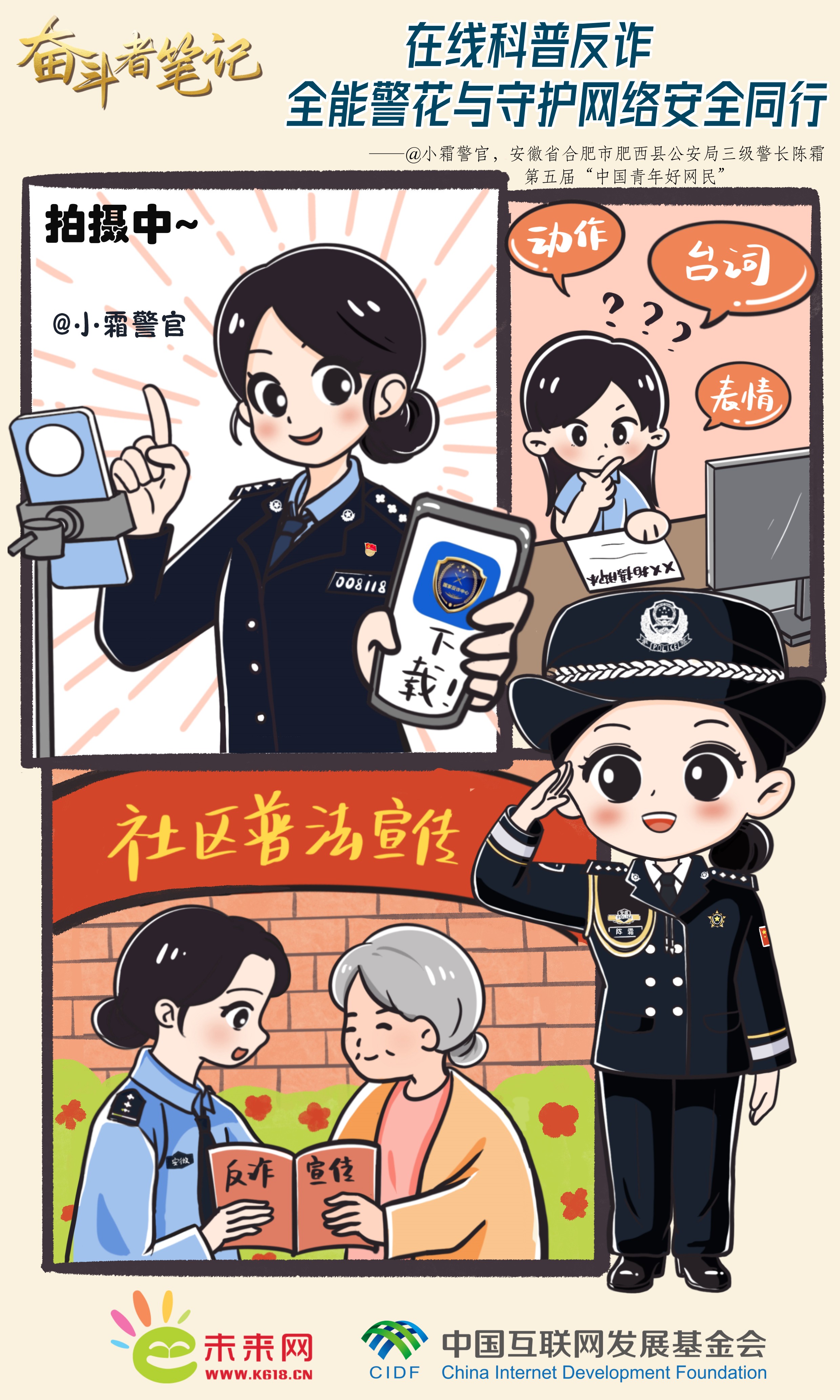 “一網(wǎng)情深”筑防線,心系百姓護安寧。面對在辦案過程中遇到的百姓養(yǎng)老錢、救命錢被騙的情況,陳霜愈發(fā)感到防范電詐和打擊電詐同樣重要。她創(chuàng)建“小霜警官”警務自媒體賬號,認真研究分析電信網(wǎng)絡詐騙的規(guī)律特點、思考防詐辦法,用大家喜聞樂見的形式為百姓普法、宣傳反詐知識。她還積極探索宣傳新路徑,緊跟時事熱點,將防詐知識寫成幽默風趣的段子、引人入勝的故事和生動的短劇。自2016年以來,“小霜警官”累計推出了反詐、普法、便民等內(nèi)容原創(chuàng)短視頻500余個,總粉絲量過800萬,全平臺播放量超50億。正如她的個性簽名所寫——“一個特別接地氣的警察朋友”,親民的形象和接地氣的宣傳方式,讓她受到了廣大網(wǎng)友的關注和喜愛。