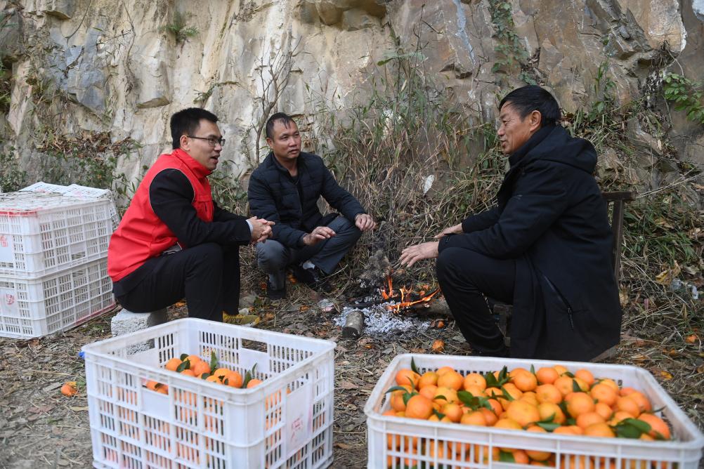 2023年12月25日,在廣西百色市樂(lè)業(yè)縣新化鎮(zhèn)百坭村,百色市委宣傳部駐百坭村第一書記農(nóng)俊海(左一)向群眾了解砂糖橘行情。新華社記者 陸波岸 攝
