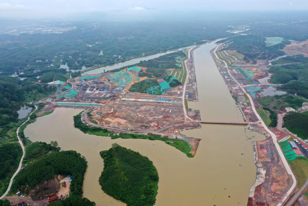這是施工建設(shè)中的廣西平陸運(yùn)河青年樞紐(2023年8月1日攝,無(wú)人機(jī)照片)。新華社記者 陸波岸 攝