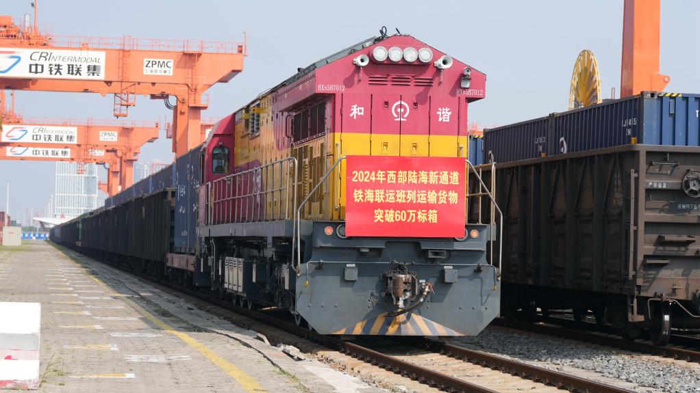 2024年9月14日,一列帶有突破60萬(wàn)標(biāo)箱標(biāo)志的鐵海聯(lián)運(yùn)班列準(zhǔn)備從欽州鐵路集裝箱中心站駛出。新華社記者 張愛(ài)林 攝