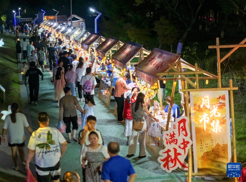 9月15日,游客在江蘇省泰興市龍河灣公園逛“月光市集”(無(wú)人機(jī)照片)。