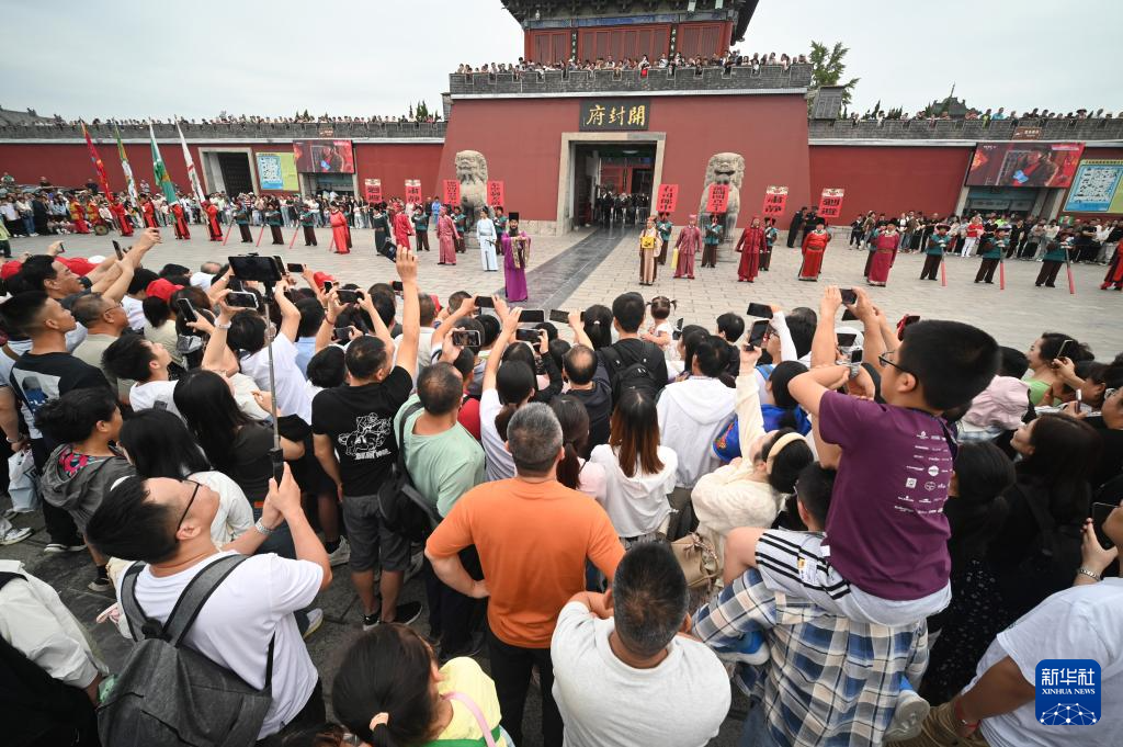 9月16日,游客在河南省開(kāi)封市開(kāi)封府門(mén)前觀看《開(kāi)衙迎賓》儀式。