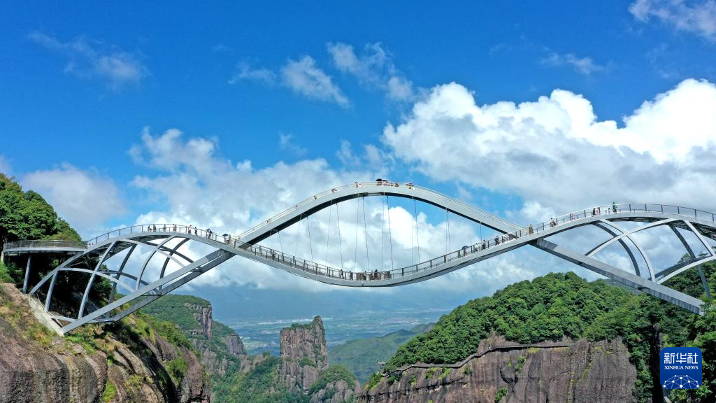 9月17日,游客在浙江省臺(tái)州市仙居縣神仙居景區(qū)如意橋上游玩(無(wú)人機(jī)照片)。
