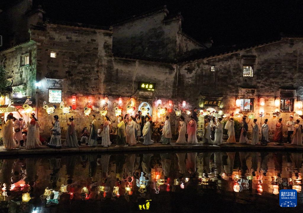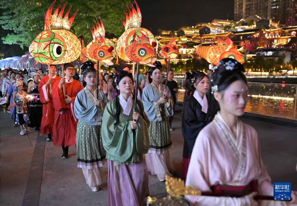 9月16日晚,在湖北省宣恩縣城貢水河畔,人們身著傳統(tǒng)服飾參加巡游活動(dòng)。