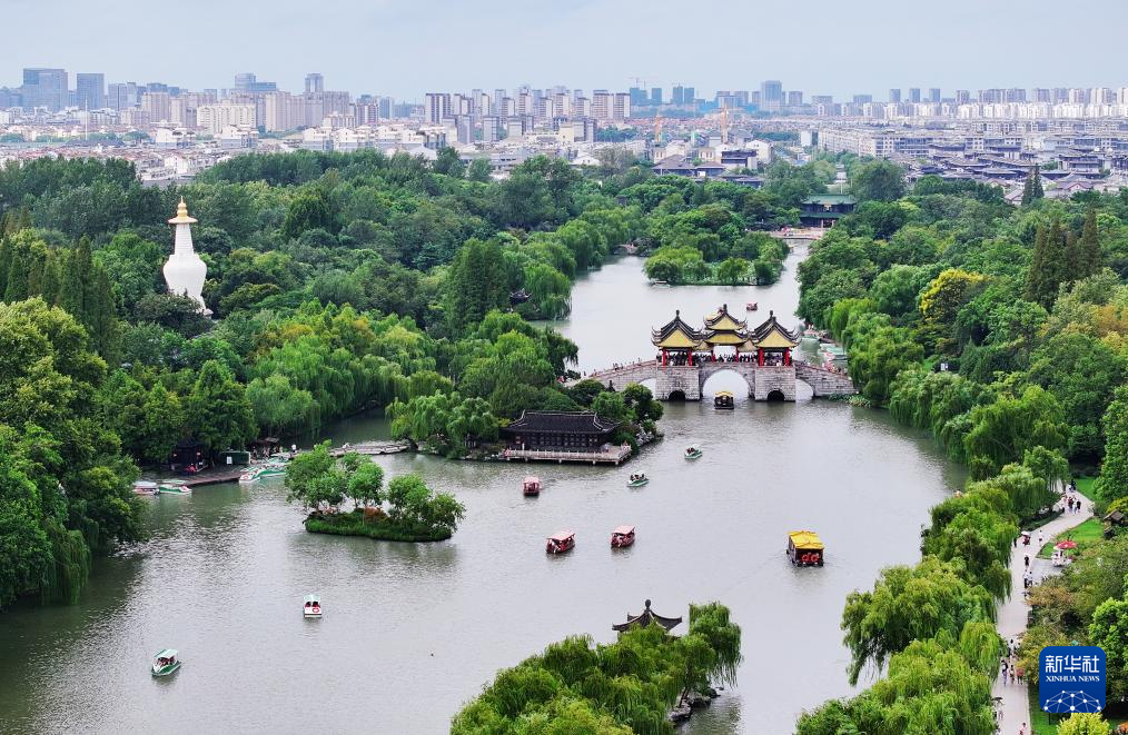 9月17日,游客在江蘇揚(yáng)州瘦西湖風(fēng)景區(qū)游玩(無(wú)人機(jī)照片)。
