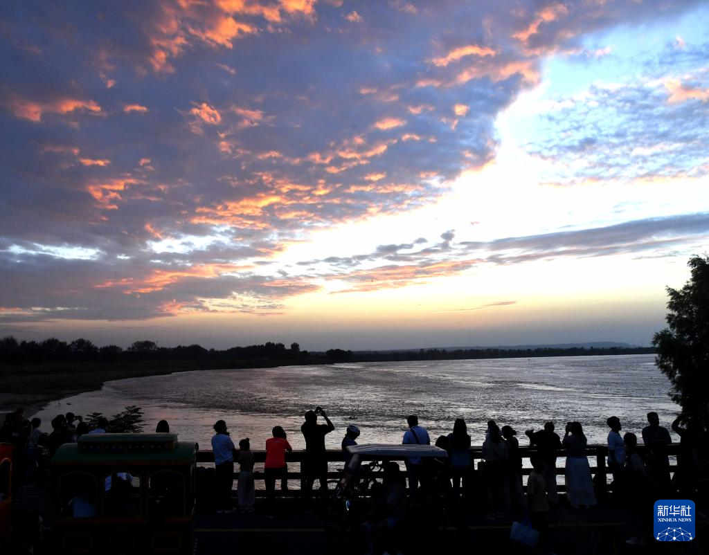 9月17日,鄭州黃河南裹頭廣場(chǎng),游客觀賞晚霞。
