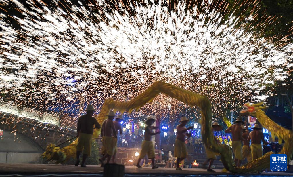9月16日,四川省成都市雙流區(qū)黃龍溪古鎮(zhèn),當(dāng)?shù)厮嚾藶橛慰捅硌輫?guó)家級(jí)非遺“火龍燈舞”。