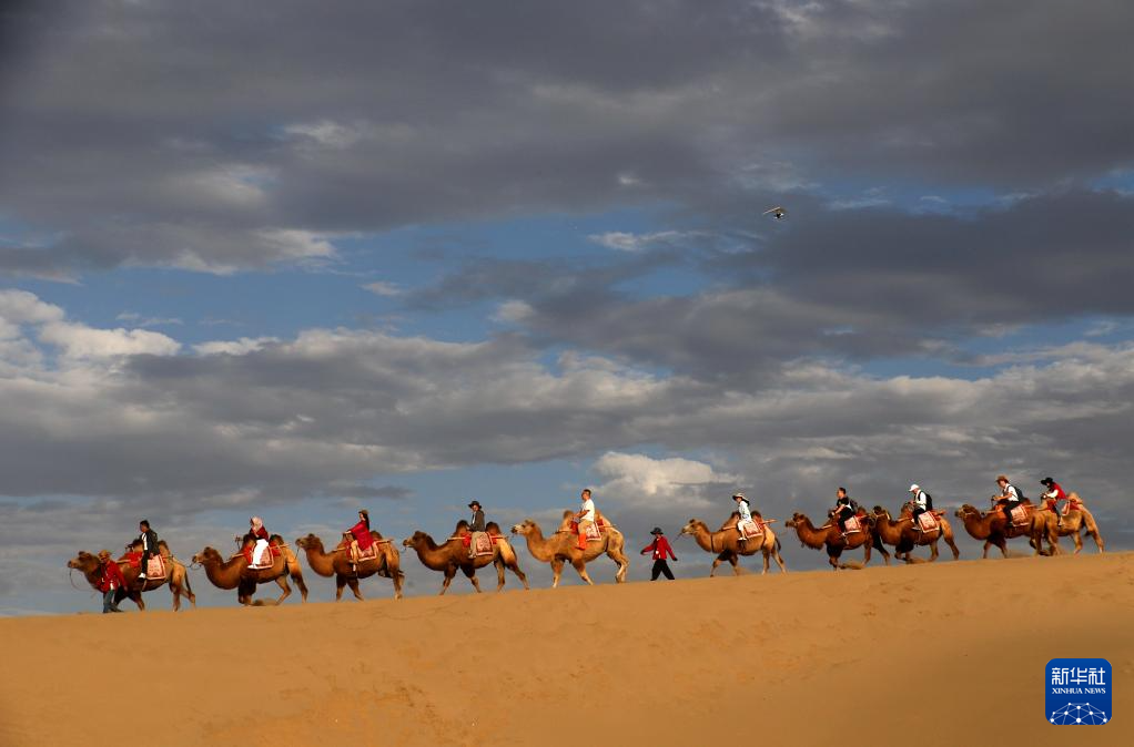 9月16日,游客在甘肅省敦煌市鳴沙山月牙泉景區(qū)游覽。