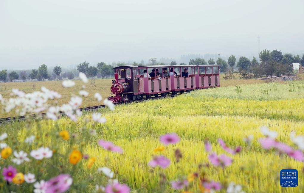 9月15日,在河南省洛陽(yáng)市汝陽(yáng)縣三屯鎮(zhèn)東保村“稻田小鎮(zhèn)”,游客乘坐小火車(chē)在稻田旅游觀光。