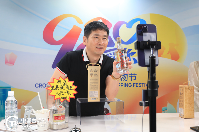 本屆購物節(jié)首場(chǎng)直播——“嘗嘗酒酒”(長長久久)兩岸好酒直播專場(chǎng)火熱開播,帶貨達(dá)人鄭云團(tuán)隊(duì)正在直播間介紹金門高粱酒“正金高”。
