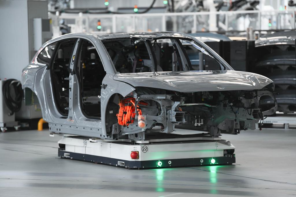 這是在安徽省合肥市新橋智能電動(dòng)汽車(chē)產(chǎn)業(yè)園蔚來(lái)第二工廠(chǎng)拍攝的新能源汽車(chē)生產(chǎn)線(xiàn)(2024年5月9日攝)。新華社記者 張端 攝