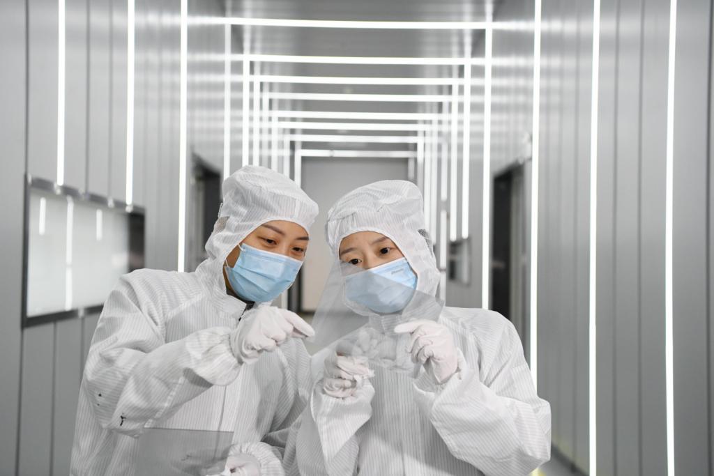 2月21日,在位于安徽合肥的東超科技工廠(chǎng),技術(shù)人員在檢查負(fù)折射平板透鏡原材料的品質(zhì)。新華社記者 張端 攝