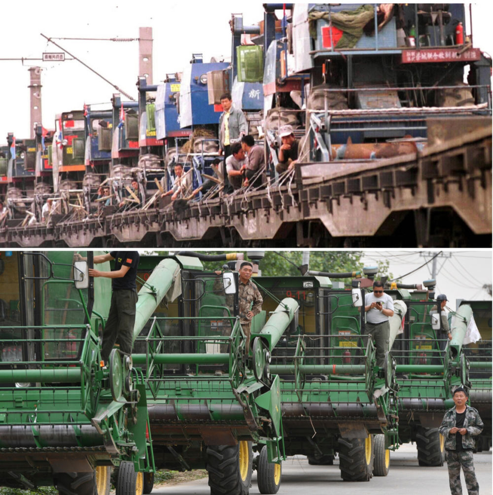 拼版照片:上圖為1999年,滿載著參加跨區(qū)收割小麥作業(yè)收割機(jī)的專列從石家莊鐵路分局正定火車站開出,將河北深州、藁城等地農(nóng)民的120多臺(tái)收割機(jī)運(yùn)往河南開封(新華社記者 周文廣 攝);下圖為2020年6月2日,在河南周口黃泛區(qū)農(nóng)場(chǎng)九分場(chǎng),農(nóng)機(jī)隊(duì)伍準(zhǔn)備出發(fā)(新華社記者 李嘉南 攝)。