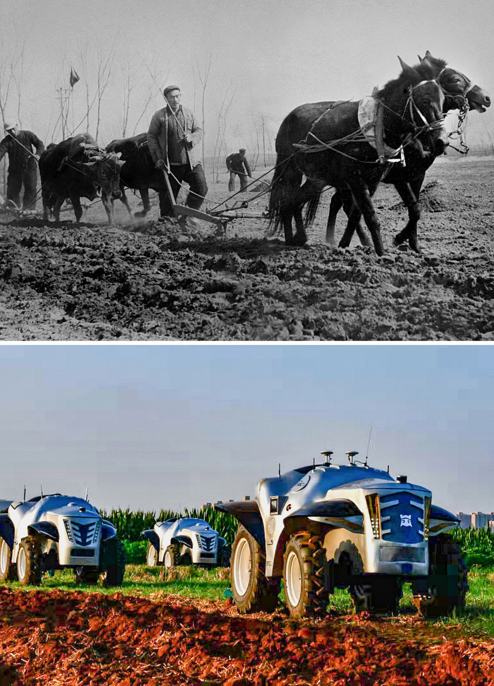 拼版照片:上圖為1954年,河南開封農(nóng)民在用傳統(tǒng)的畜拉步犁耕地(呂學(xué)召 攝);下圖為2019年7月26日,洛陽一拖集團(tuán)生產(chǎn)的純電動(dòng)無人駕駛拖拉機(jī)準(zhǔn)備做耕地測(cè)試(潘郁 攝)。