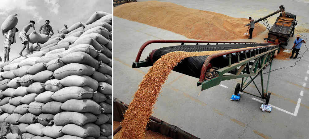 拼版照片:左圖為1959年,河南黃泛區(qū)農(nóng)場(chǎng)員工在堆放剛收打的小麥,準(zhǔn)備入倉(新華社記者 楊震河 攝);右圖為2018年6月4日,在河南黃泛區(qū)農(nóng)場(chǎng),工作人員將剛收打的小麥過篩后直接裝車,準(zhǔn)備運(yùn)往糧庫(新華社記者 李安 攝)。